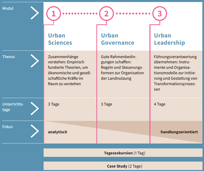 Wirkungsvolles Urban Management bedingt neben persönlichen Leadership-Fähigkeiten auch ein solides Verständnis der gesellschaftlichen Zusammenhänge sowie der regulatorischen Rahmenbedingungen. Der Urban Management-Studiengang umfasst daher drei Module: